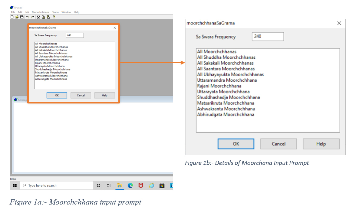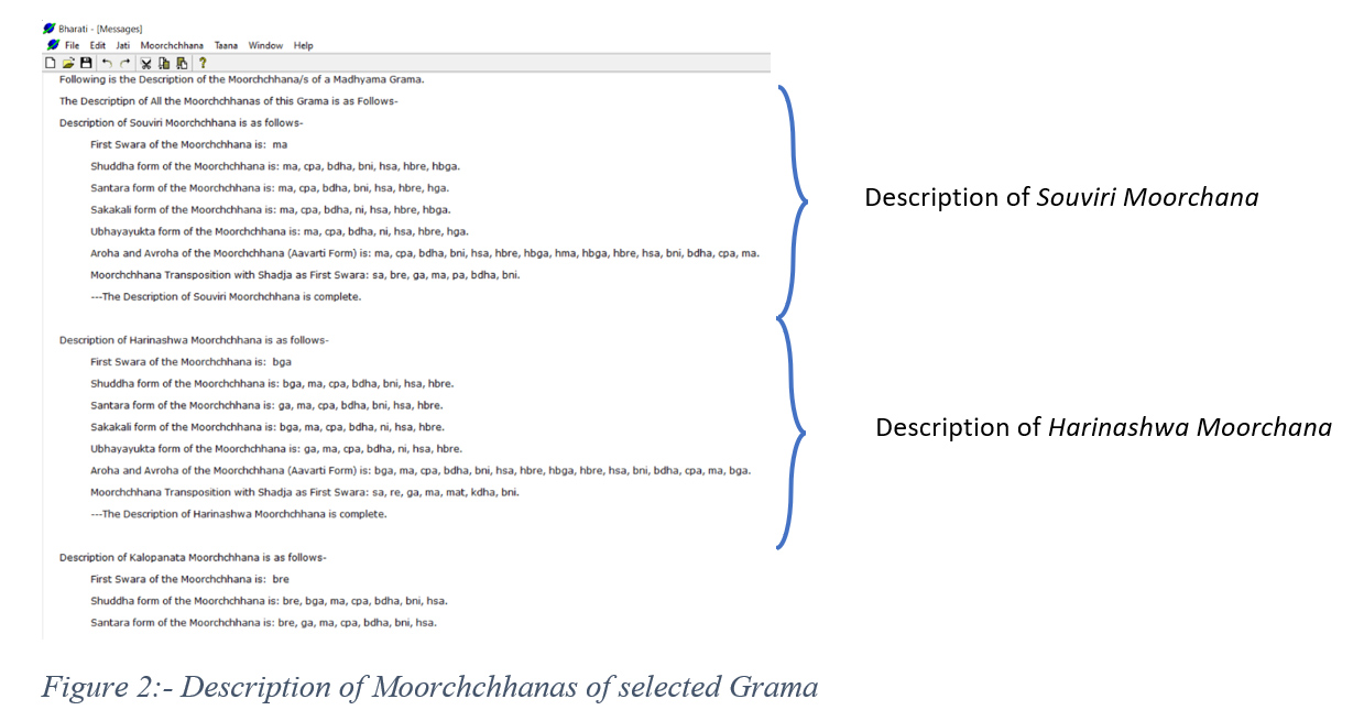 The main objective of ‘Bharati’ system is to show that the theoretical concepts from ‘Natyashastra’ and Sangeet Ratnakar are logically structured and all Sutras can be potentially simulated on computers and to preserve the knowledge treasure. This ‘smart’ book or expert system provides a textual description of the desired concepts. This smart system has all the core concepts such as Bharata Muni’s swaras, Bharata Muni’s shrutis, Shadja Grama, Madhyama Grama, types of Gandhara Grama, Shuddha Moorchchhanas, Santara Moorchchhanas, Sakakali Moorchchhanas, Ubhaya Moorchchhanas and so on. It also has the information about Sampurna Taanas, Shadava Taanas, Oudava Taanas as wellas information about 18 Jatis that include Shuddha Jatis, Samsargaja Jatis and Sadharanagata Jatis. In the following image, you can see that the dialog box for Moorchchhanas is selected and it shows a long list of entries.